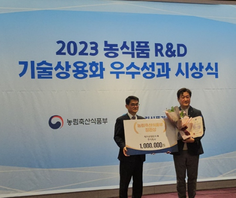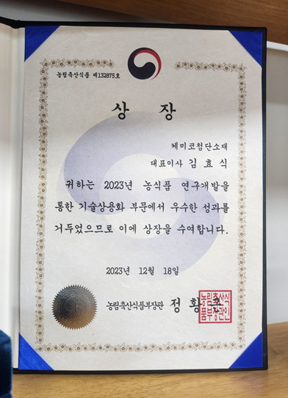 2023년 농식품 연구개발을 통한 기술상용화 부분에서 플라스틱 사용량을 원천감량하는 고배율 발포PP 식품용기로 "농림축산식품부 장관상"을 수상하였음