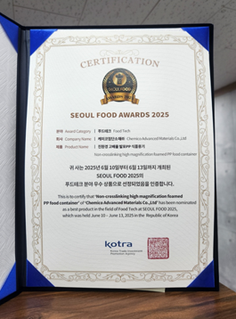 플라스틱 사용량을 원천감량하는 친환경 고배율 발포PP 식품용기로 전시회에 참가한 1600여개사 중 20개사에 선정되어 2025년 서울푸드 어워즈 푸드테크분야를 수상하였음