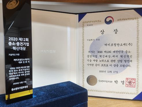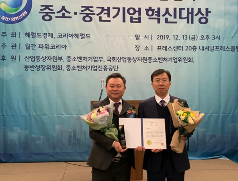 제 12회 대한민국 중소·중견기업혁신대상에서 고분자를 어떠한 화학제를 이용하지 않고 발포하여 플라스틱 사용량을 원천감량하는 무가교 연속압출발포기술로 기술혁신부문에서 "중소벤처기업부 장관상"을 수상하였음